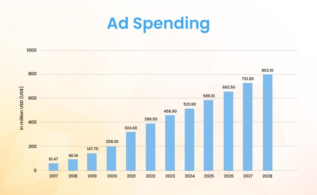 The total ad spending on digital platforms is expected to reach $589.10 million in 2024, and it’s projected to increase to $874.50 million by 2029 (based on the provided chart). This reflects the ongoing shift towards influencer-driven advertising as brands move away from traditional media.