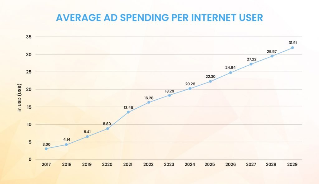The growing influence of social media is reflected in ad spending. The average ad spending per internet user has grown from $3 in 2017 to $20.26 in 2024 (as seen in the graph). This increase highlights how brands are investing more in digital advertising, including influencer marketing.